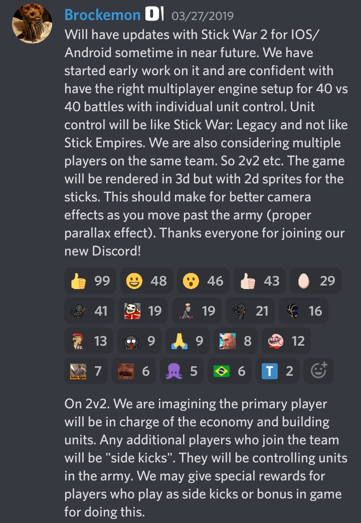 Brockemon posted an update at the 27th of March, 2019 about it in the #official-news section of the Official Discord Server for the Stick War Series. A screenshot of it can be found on the right. Here's a basic summary of the information there: